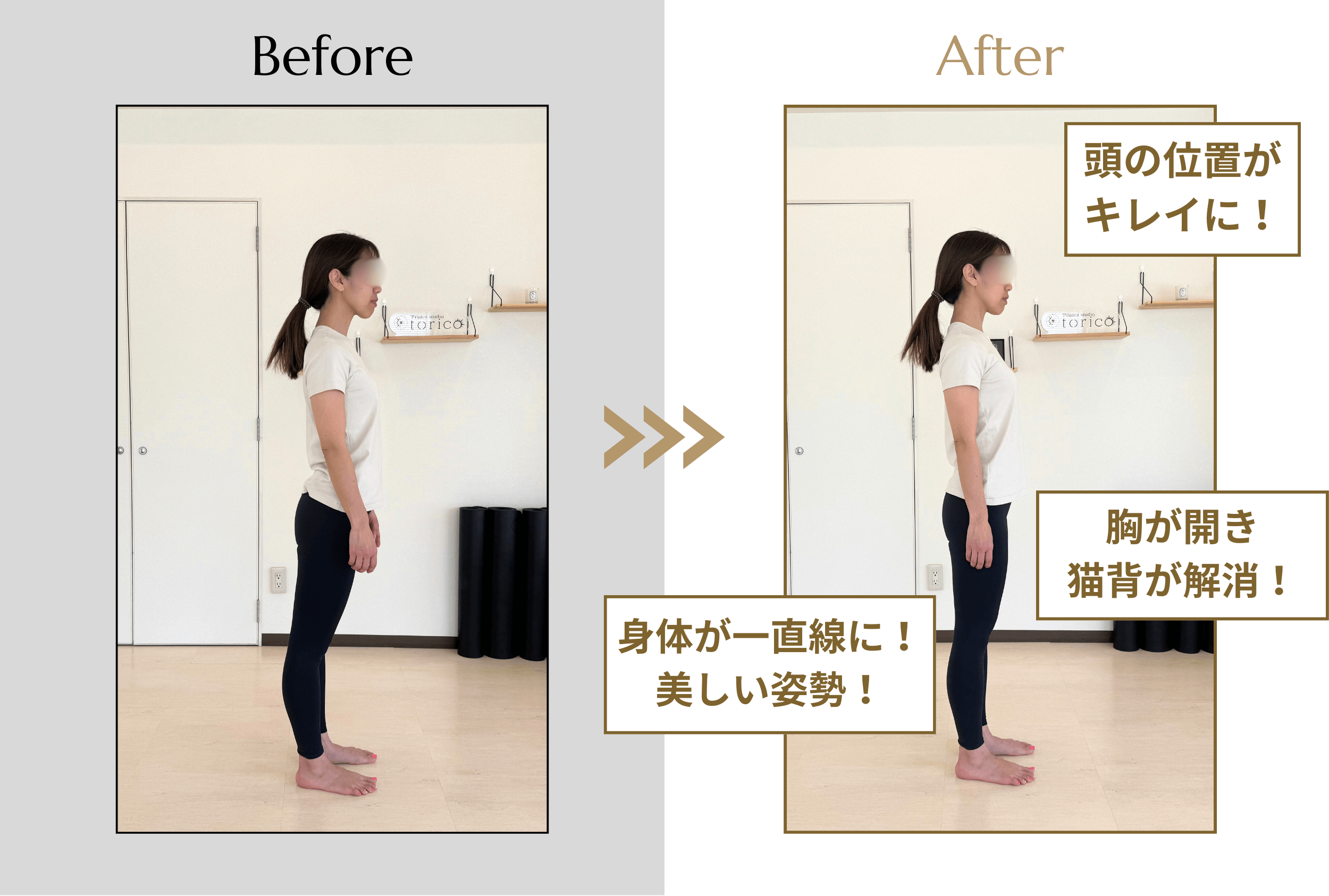 反り腰で身体が前に傾いてしまう姿勢でしたが、3人制レッスンで頭・肩・腰・足首など全身の位置が整い、猫背や反り腰も改善。まっすぐで綺麗な姿勢になることができました。