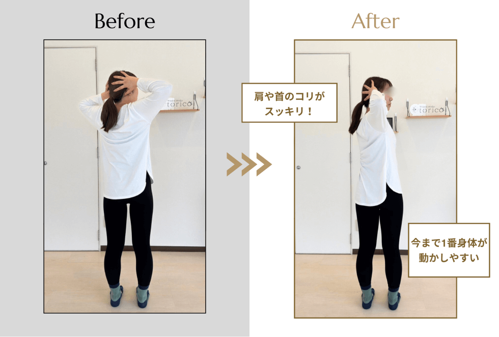 週1回のパーソナルで可動域が広がり、首こりや肩こりも軽減。