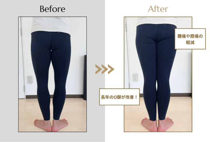 当初は立った姿勢で脚の間に大きな隙間ができ、膝の痛みや変形を感じていました。週1回のパーソナルピラティスでお尻の筋肉や太ももの筋肉をはじめ脚全体の筋力が強化され、引き締まったまっすぐな脚になりました。