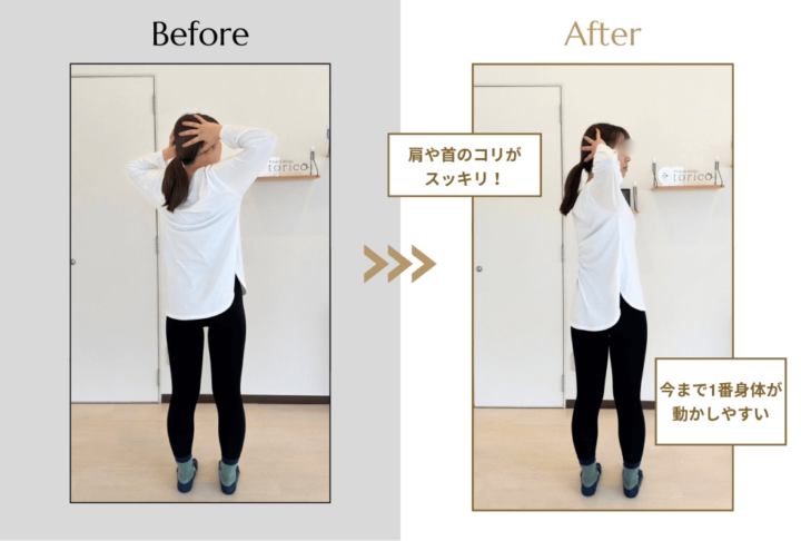 産後で首や肩まわりの動きが硬く、振り向き姿勢がつらかった会員さま。